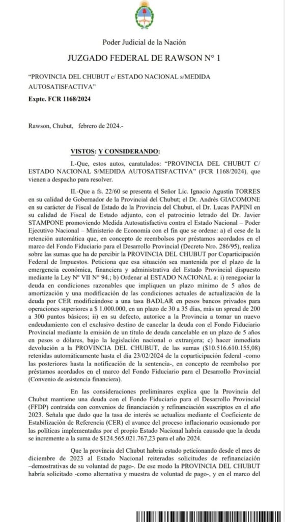 La Justicia determinó este martes que se deberá refinanciar la deuda y devolver los fondos de la coparticipación a Chubut, tras el reclamo al Gobierno, que generó la pelea entre el gobernador Ignacio Torres y el presidente Javier Milei.