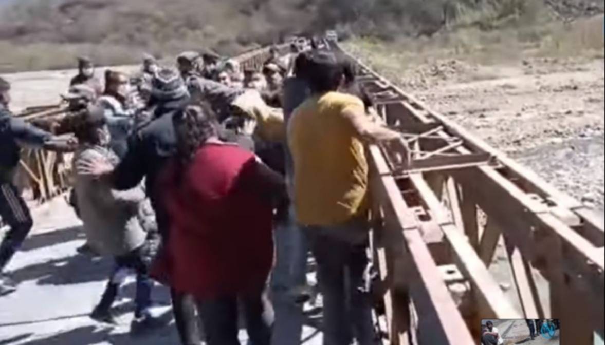 En las imágenes difundidas se observa de un lado a personas que con vallas de madera improvisadas y hasta con palos en la mano aguardan de un lado del puente.